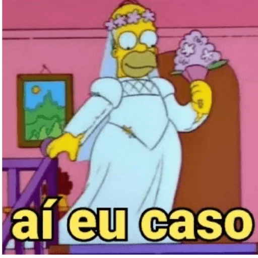 Uma imagem do desenho 'Os Simpsons' mostrando Marge Simpson vestida de noiva com um véu e uma coroa de flores, segurando um buquê, com a legenda 'aí eu caso'.