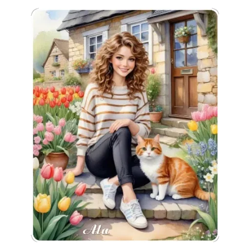 Uma jovem com cabelos cacheados sentada nos degraus de uma casa de pedra, com um gato laranja ao lado, cercada por flores coloridas como tulipas e outras plantas.