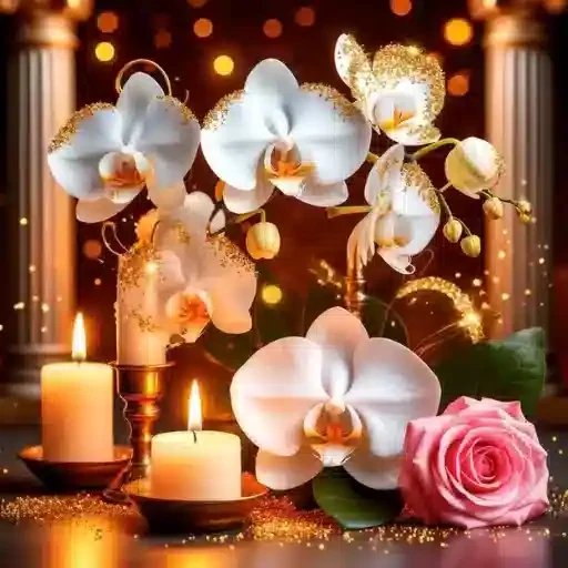 Orquídeas brancas com detalhes em ouro e uma rosa rosa ao lado de velas acesas em ambiente luxuoso com luzes quentes ao fundo.
