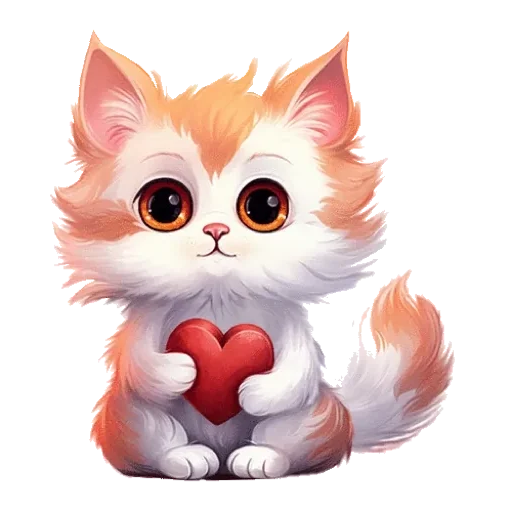 Gatinho fofo com pelos laranjas e brancos, olhos grandes e expressivos, segurando um coração vermelho.