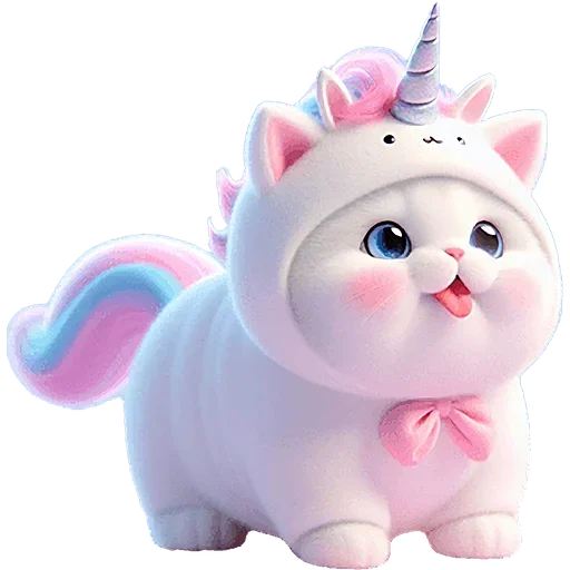 Gatinho fofinho com chifre de unicórnio rosa e azul, orelhas cor-de-rosa, olhos azuis e laço rosa no pescoço.
