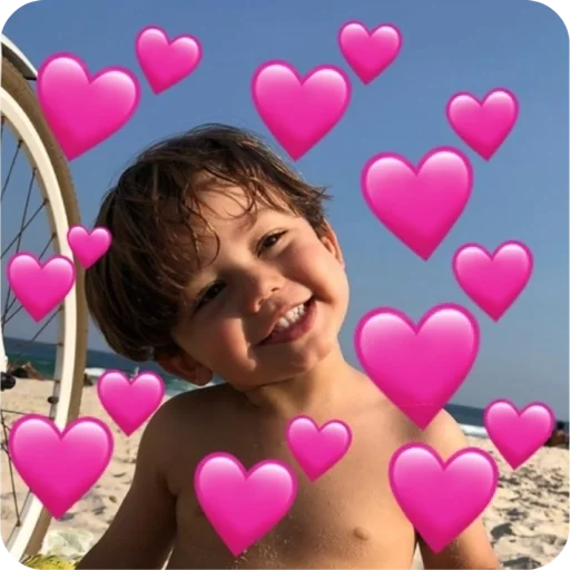 Menino sorrindo na praia com muitos corações rosa ao redor.