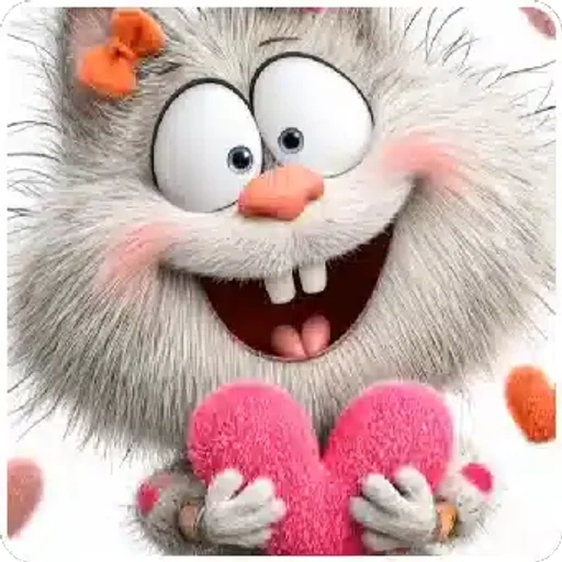 Um gato fofo com um laço laranja no cabelo e um coração rosa na mão, com uma expressão feliz e bochechas rosadas.