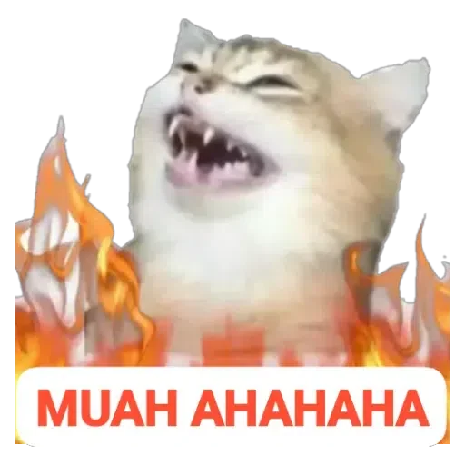 Gato com expressão de alegria exagerada, rodeado de chamas, com texto 'MUAH AHAHAHA' em vermelho.