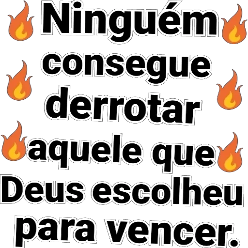 Uma frase inspiradora em preto com chamas laranjas ao redor, 'Ninguém consegue derrotar aquele que Deus escolheu para vencer.'