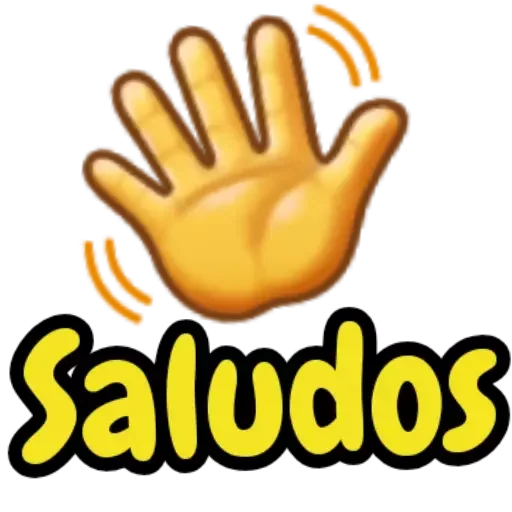 Uma mão amarela com cinco dedos estendidos e a palavra 'Saludos' em letras amarelas abaixo. A mão tem linhas laranjas ao redor, indicando movimento.