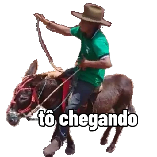 Um homem de chapéu e camiseta verde montado em um burro com rédeas vermelhas, texto 'tô chegando' sobreposto.