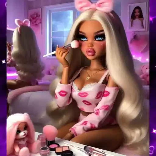 Uma boneca de brinquedo com cabelo loiro e uma faixa rosa aplicando maquiagem com um pincel, sentada em frente a uma mesa com itens de maquiagem.
