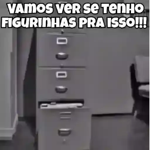 Uma imagem em preto e branco de uma gaveteiro de metal com uma gaveta aberta, com o texto 'VAMOS VER SE TENHO FIGURINHAS PRA ISSO!!!' sobreposto.