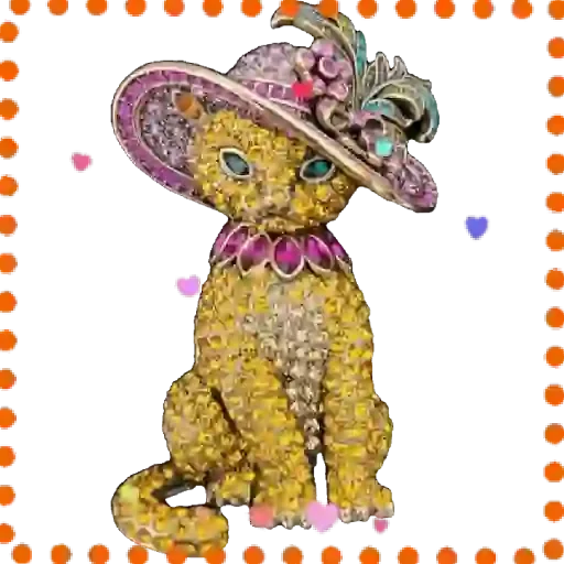 Gato amarelo com chapéu rosa decorado e colar de pérolas, emoldurado por uma borda de pontos laranja e corações.