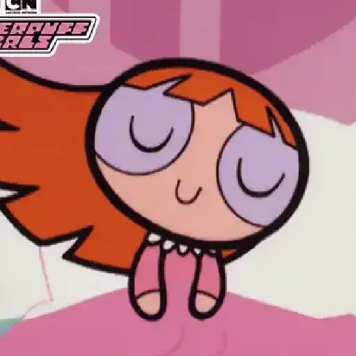Uma menina de olhos roxos fechados e cabelos vermelhos, vestindo uma roupa rosa, com um fundo rosa e branco. Há um logotipo no canto superior esquerdo que parece ser do Cartoon Network.