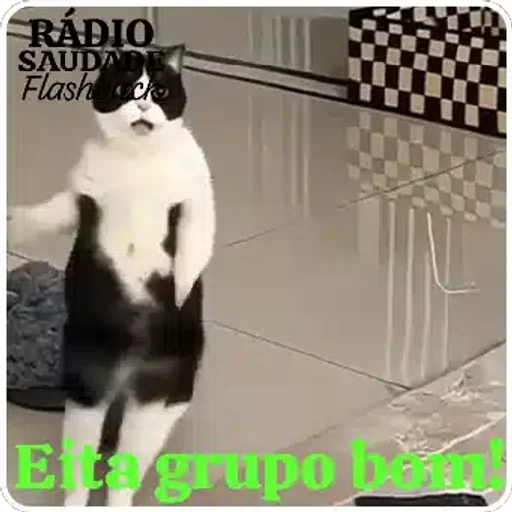 Um gato preto e branco com uma expressão facial engraçada, em uma pose curiosa. O texto 'RÁDIO SAUDADES Flash' aparece no canto superior esquerdo e 'Eleita grupo bem!' em verde no canto inferior direito.