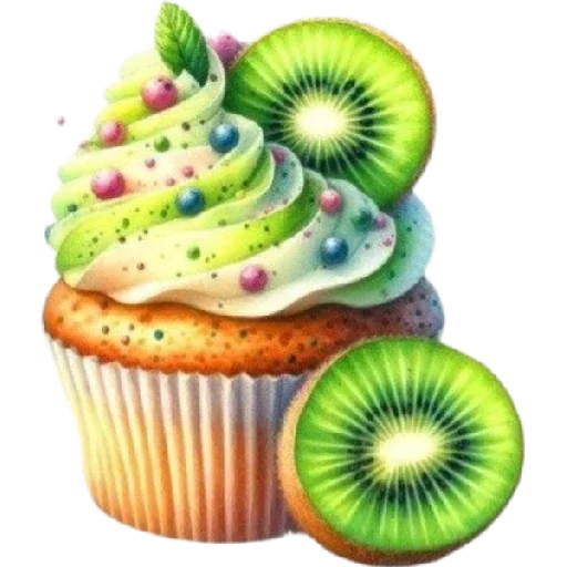 Um cupcake com cobertura verde decorada com confeitos coloridos e uma fatia de kiwi, acompanhado de mais duas fatias de kiwi.