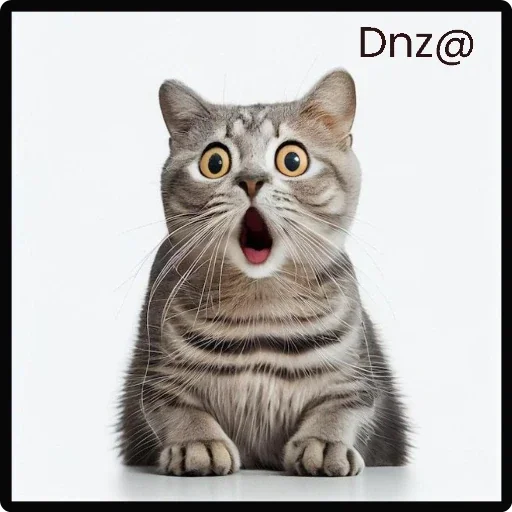 Gato cinza com olhos amarelos e boca aberta, parecendo surpreso ou assustado. O texto 'Dnz@' aparece no canto superior direito.