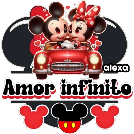 Mickey e Minnie Mouse apaixonados em um carro vermelho com o texto 'Amor infinito'.