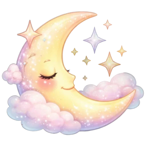 Lua crescente com rosto sorridente, olhos fechados e bochechas rosadas, cercada por estrelas e nuvens fofas.