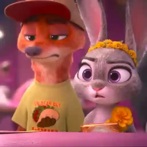 Um casal de personagens de desenho animado, um coelho e um raposa, com expressões faciais curiosas. O coelho usa uma coroa de flores amarelas e o raposa um boné vermelho e uma camiseta verde com um logotipo.