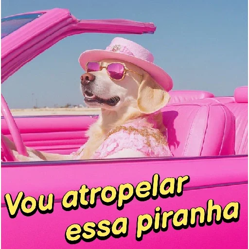 Cachorro de óculos de sol e chapéu rosa dirigindo um carro rosa. 'Vou atropelar essa piranha'