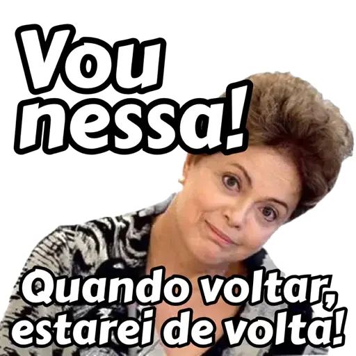 Uma mulher com cabelo castanho e um casaco preto e branco olhando para a câmera com um sorriso, com o texto "Vou nessa! Quando voltar, estarei de volta!" sobreposto.