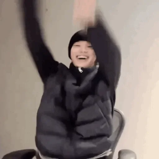 Homem asiático com jaqueta preta e gorro preto, com os braços levantados e expressão de alegria.