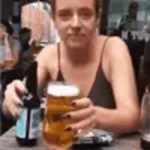 Mulher sentada à mesa, segurando uma cerveja gelada com espuma branca e uma garrafa de cerveja, vestindo um top preto.