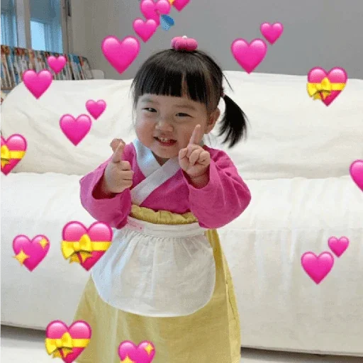 Menina com franja e rabo de cavalo usando um hanbok rosa e amarelo, fazendo careta e apontando para você, cercada por corações rosa e alguns com bandeiras da Coreia do Sul.