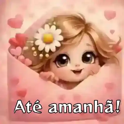 Menina de cabelos castanhos e olhos grandes com uma flor na cabeça, rodeada de corações e 'Até amanhã!'