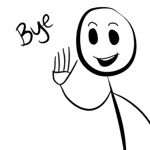 Um desenho simples de uma pessoa com um sorriso, acenando com a mão e a palavra 'Bye' escrita ao lado.