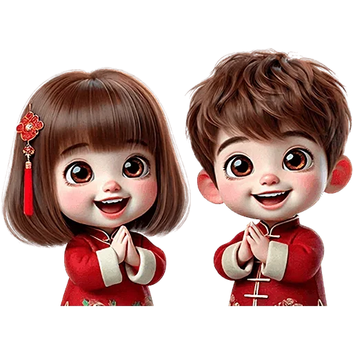 Dois personagens de anime infantil, um menino e uma menina, vestidos com roupas vermelhas tradicionais chinesas com…