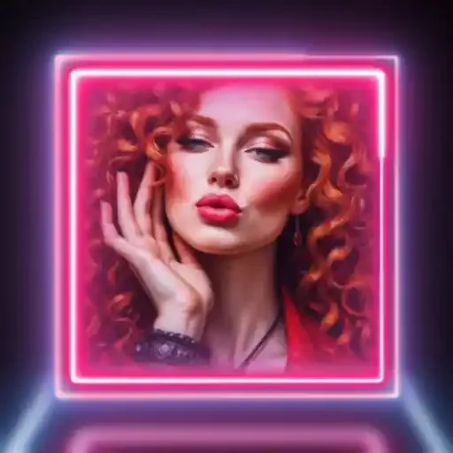 Uma mulher loira com cabelos ondulados e maquiagem colorida aparece em um quadro rosa com contorno de neon. Ela está com a mão perto do rosto e tem uma expressão sensual.