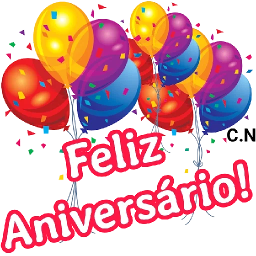 Balões coloridos com confetes e o texto 'Feliz Aniversário!' em letras vermelhas.