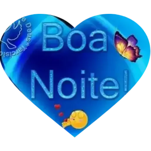 Um coração azul com a frase 'Boa Noite!' em letras azuis, acompanhada de uma borboleta colorida e um balão amarelo com foguinhos.