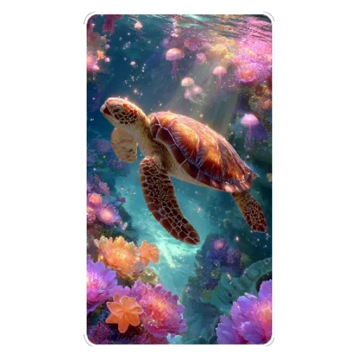 Uma tartaruga marinha nadando em um ambiente aquático colorido com coral e peixes, em um fundo azul com bolhas de ar.