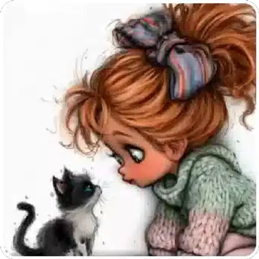 Menina com cabelo ruivo e um laço grande olhando um gato preto e branco.