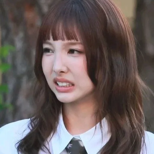 Uma jovem com cabelos castanhos e expressão de surpresa ou preocupação, com um emoji de rosto amarelo e sobrancelhas…