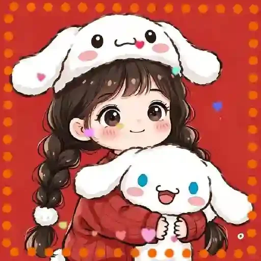 Menina fofa com tranças castanhas e chapéu de coelho branco, abraçando um ursinho branco com olhos azuis e bochechas rosadas, em fundo vermelho com borda de pontos laranja.