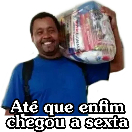Um homem sorrindo, carregando uma bolsa de compras no ombro, com a frase 'Até que enfim chegou a sexta' em texto preto com fundo branco na parte inferior.