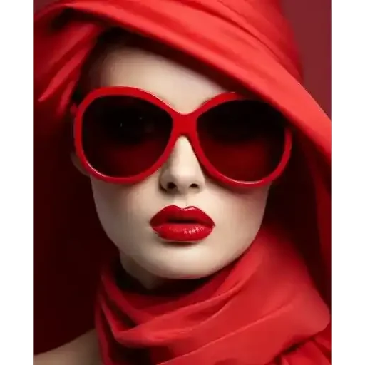 Rosto de mulher com óculos de sol vermelhos e batom vermelho, coberta por um tecido vermelho.