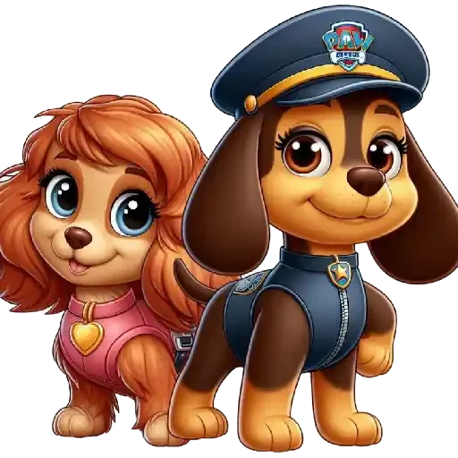 Dois personagens de desenho animado, uma cachorrinha de pelo laranja e um cachorro de pelo castanho com um chapéu de policial.
