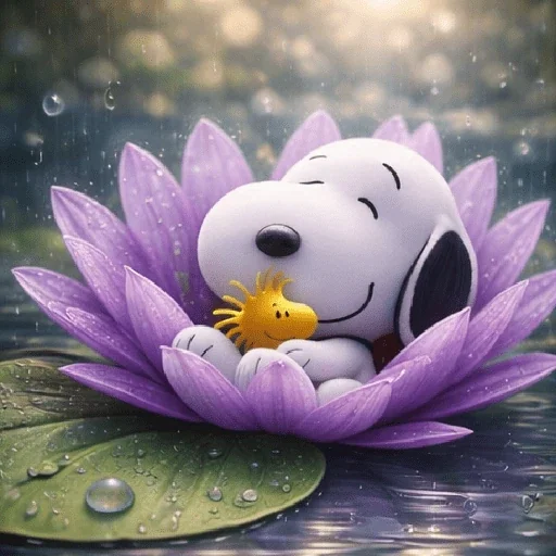 Snoopy e Woodstock sentados em uma flor de lótus roxa com gotículas de água, Snoopy com os olhos fechados e um sorriso no rosto.