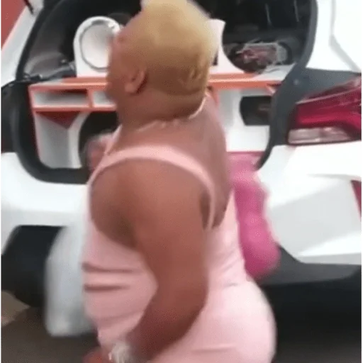 Uma menina pequena e negra vestida com um vestido rosa está dançando em frente a um carro branco.