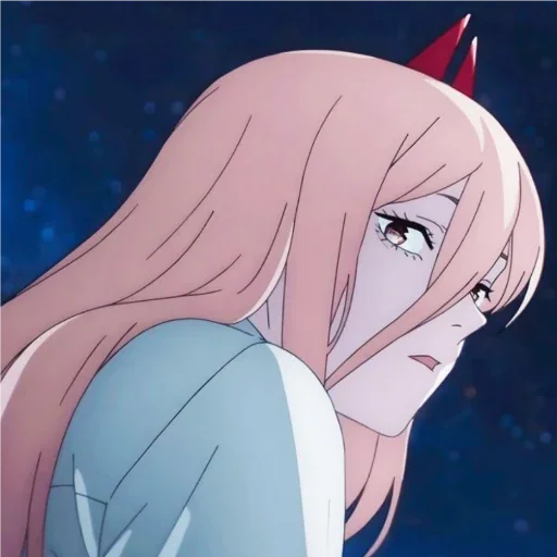 Uma garota de anime com cabelos rosa e chifres vermelhos, vestindo uma camisa azul e branca, olhando para o lado com uma expressão séria.