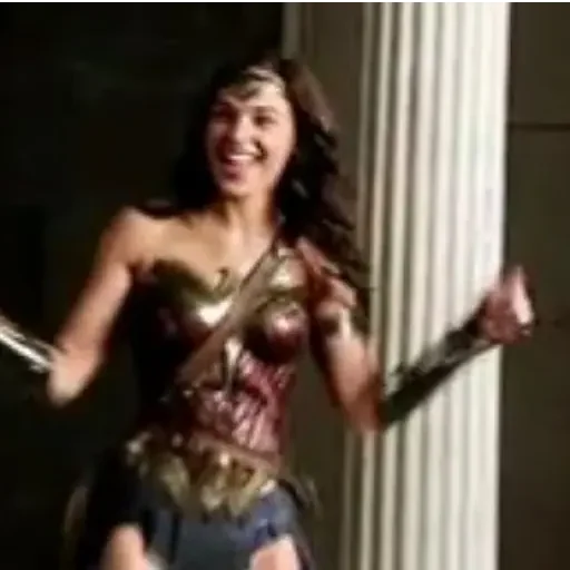 Mulher-Maravilha usando sua tiara e traje de batalha, com uma expressão de raiva ou surpresa, correndo com uma coluna ao fundo.