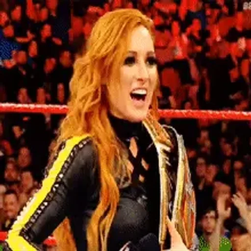 Mulher loira com um look de lutadora, usando um macacão preto com detalhes em amarelo, em um ringue de luta com uma multidão ao fundo.