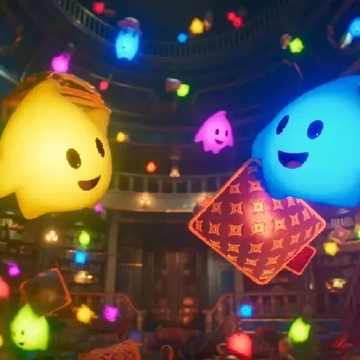 Dois personagens coloridos com expressões alegres estão suspensos no ar em um ambiente noturno com luzes coloridas.