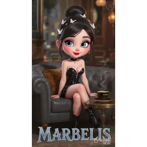 Uma garota de anime sentada em um sofá, vestindo um vestido preto, com o cabelo escuro e adornos brancos. Ela está em um ambiente escuro com detalhes de luxo.