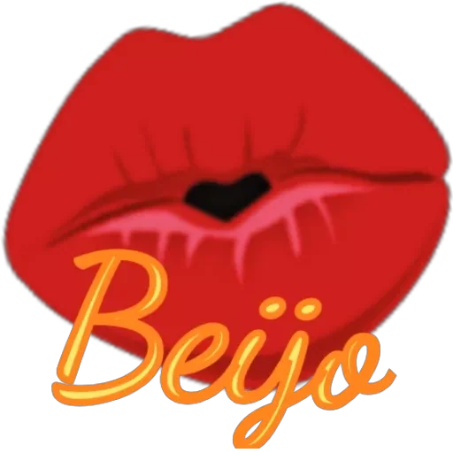 Um par de lábios vermelhos com um coração preto no centro e o texto 'Beijo' em laranja cursivo.