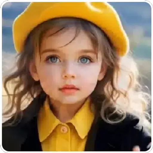Menina com cabelos castanhos ondulados e olhos azuis claros, usando um chapéu amarelo, camisa amarela e jaqueta preta.