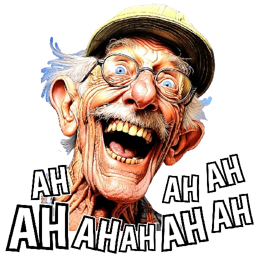 Um homem idoso com um chapéu e óculos, mostrando uma expressão de surpresa ou choque, com a boca aberta e olhos arregalados. Ele está acompanhado de várias 'AH' e 'AHAH' ao redor.