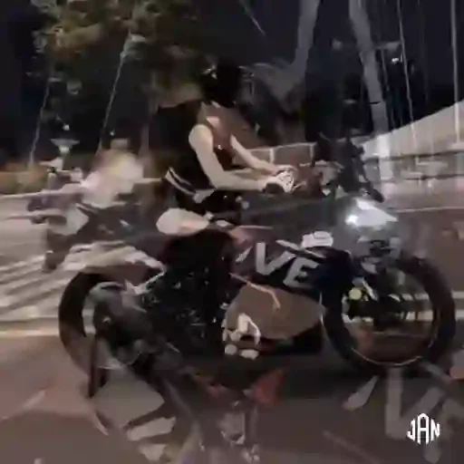 Um homem de terno preto e óculos de sol pilotando uma moto com a palavra 'LOVE' no lado, em um cenário urbano noturno.
